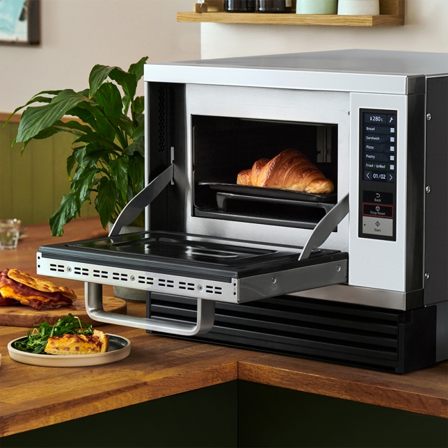 Mit den verschiedenen Garmethoden und dem Kombigaren können Sie von Frühstücksköstlichkeiten über geröstete Sandwiches, warme Croissants oder Baguettes / Tapas bis hin zu tiefgefrorenen Pizzastücken / -schiffchen alles zubereiten.
