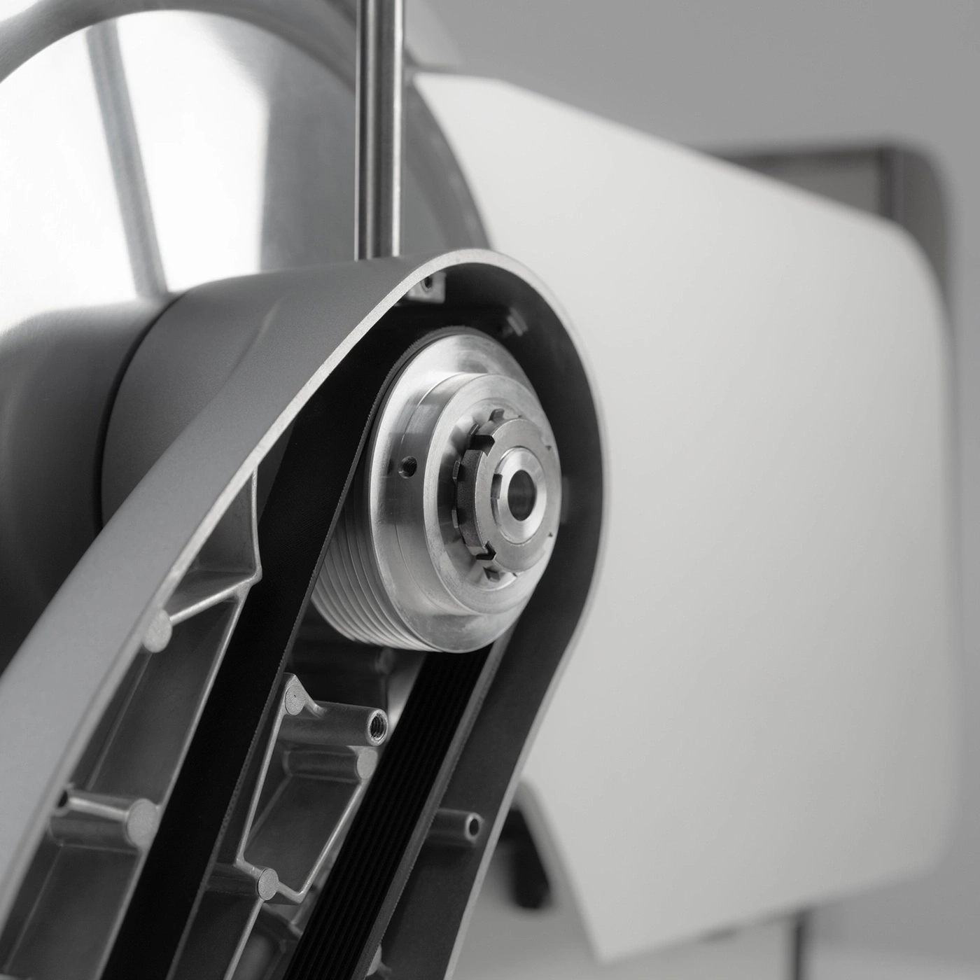 Küchenwaagen lassen sich an die Maschine ansetzen - Hybridantrieb ermöglicht wirkungsvolle und wartungsfreie Kraftübertragung bei jedem Schneidgut. Eine effiziente Kombination aus Getriebe- und Riemenantrieb.