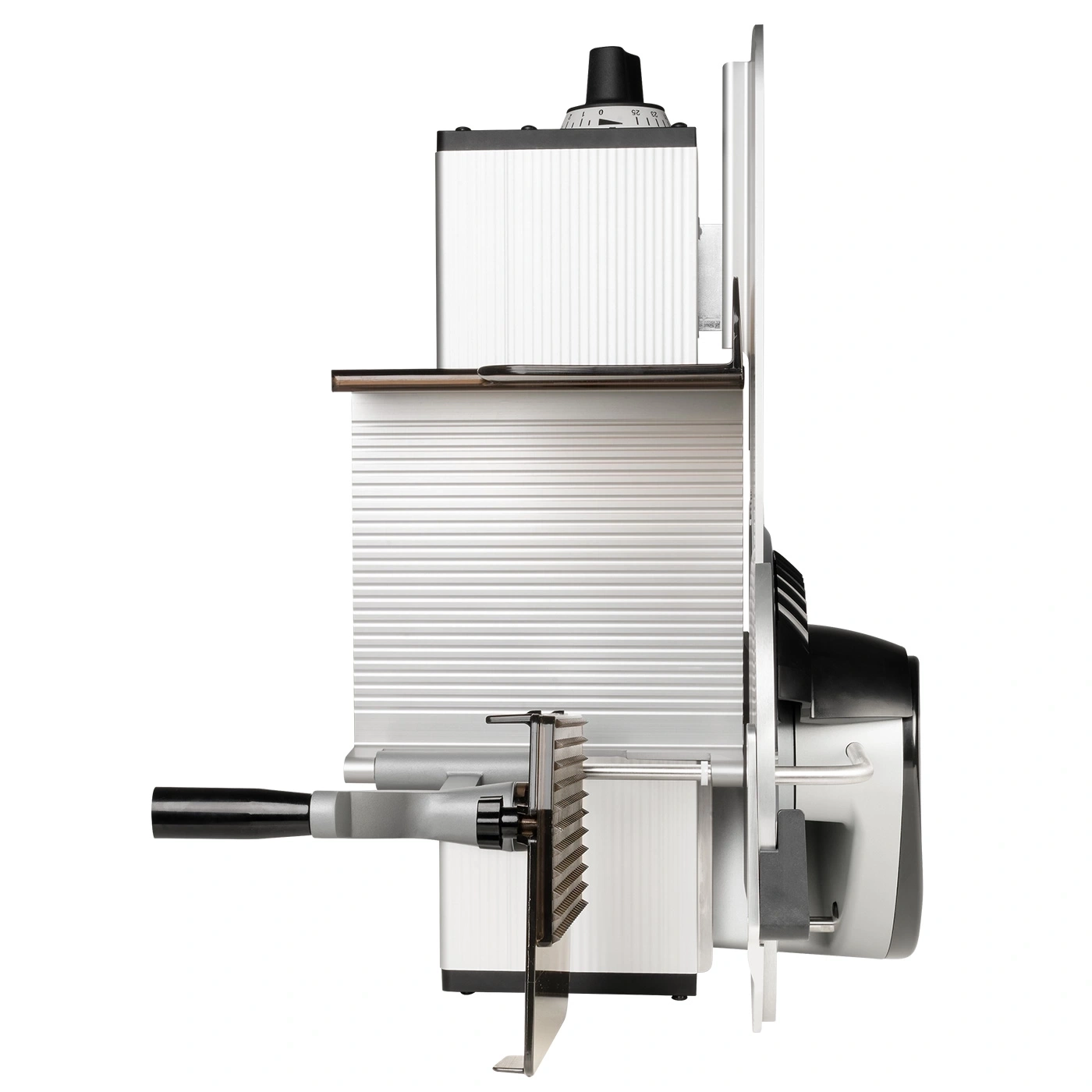 - Einfache Reinigung: Das Messer und die Flächen sind von allen Seiten frei zugänglich, Messerabdeckplatte und Abstreifer sind leicht abnehmbar und der Schlitten um 90° abklappbar.