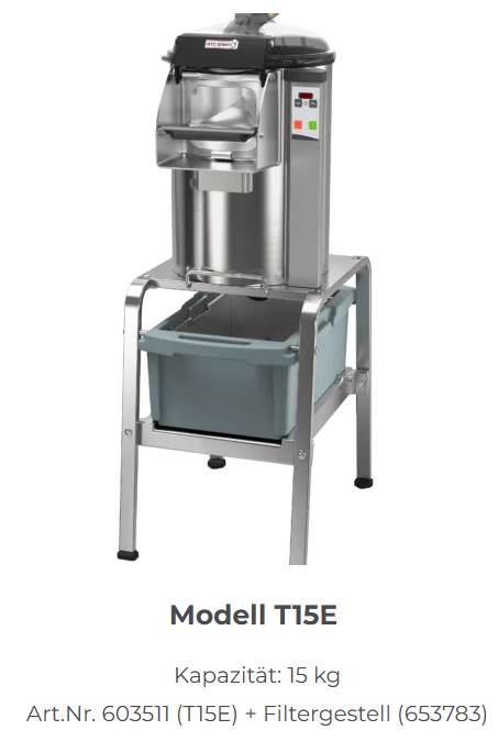 Paket beinhaltet: 603511 Gemüseschäler 15 kg - 230Volt - inkl. Carborundum-Reibscheibe und 653783 Edelstahl-Filtergestell inkl.