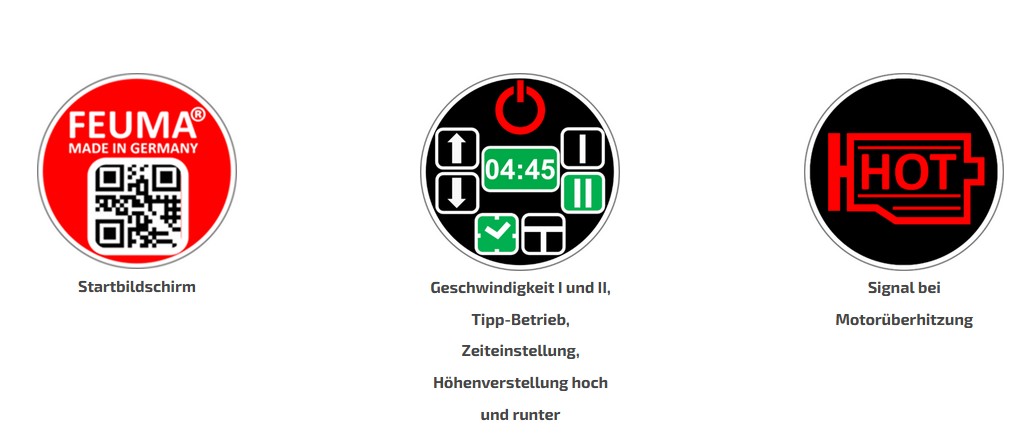 - Servicemeldungen (Anzeige der Nutzungsdauer, einstellbare Programmdauer, Signal vor Motorüberhitzung)