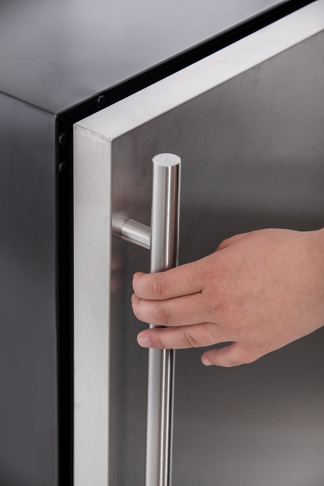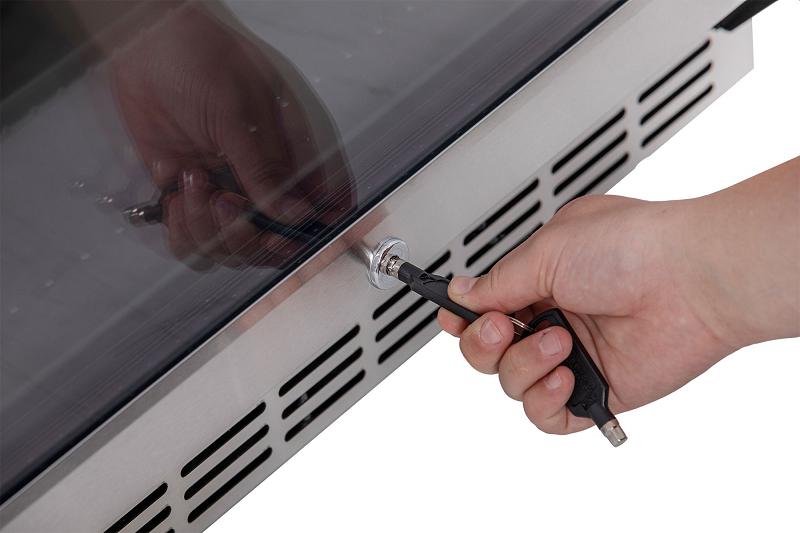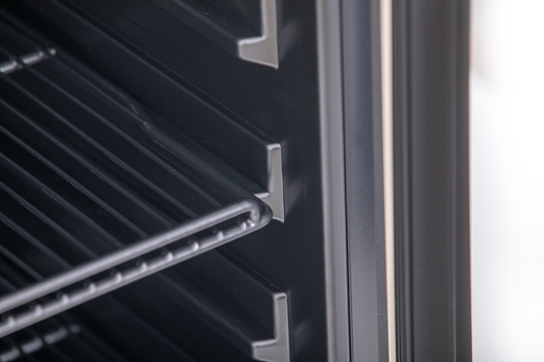 Die Außenseite des Kühlschranks ist schwarz lackiert, während die Edelstahltür mit Schloss für Sicherheit und Langlebigkeit sorgt. Die Glastür 3-fach isolierverglast, bietet optimaen Einblick auf die zu verkaufende Ware. Die selbstschließende Tür und der pflegeleichte Innenraum aus schwarzem Kunststoff machen den Kühlschrank besonders benutzerfreundlich.