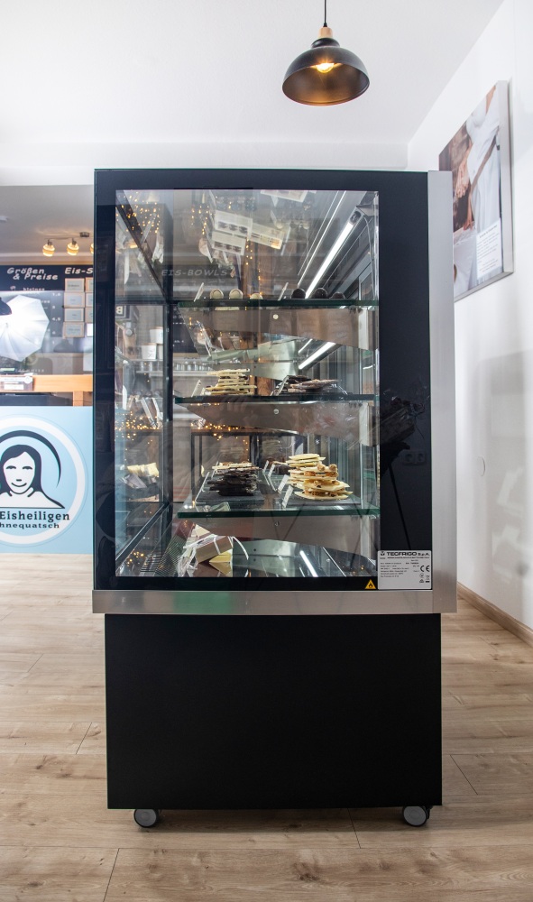 5-seitig isolierverglaste Kuchenheke mit Umluftkühlung. Die höhenverstellbaren (32 mm) Auflagewinkel der Glasböden und der innere Boden sind in CNS gefertigt. Die LED-Beleuchtung, die sich frontseitig unter dem oberen Glasrahmen befindet ist separat an der Vitrine, außen ein-/ausschaltbar. Die Temperatur wird mit einem elektronischen Thermostat gesteuert und die Innenraumtemperatur ist durch die digitale Temperaturanzeige gut ablesbar. In dem Gerät wird eine max. Luftfeuchte von 70% erreicht. Die Türen und der Rahmen sind aus Aluminium silber eloxiert gefertigt, selbstverständlich sind die Türdichtungen servicefreundlich ohne Werkzeug wechselbar. Die Vitrine ist mit 4 Rollen versehen von denen 2 Stück mit Bremsen ausgerüstet sind. Das Glas ist mit einer schwarzen Rahmenfolie abgesetzt und zwischen dem schwarzen Holz furnierten Aggregateunterbau befindet sich ein Aluminiumrahmen. Bedienerseitig ist das Lüftungsblech aus CNS hergestellt. Keine Lagertheke