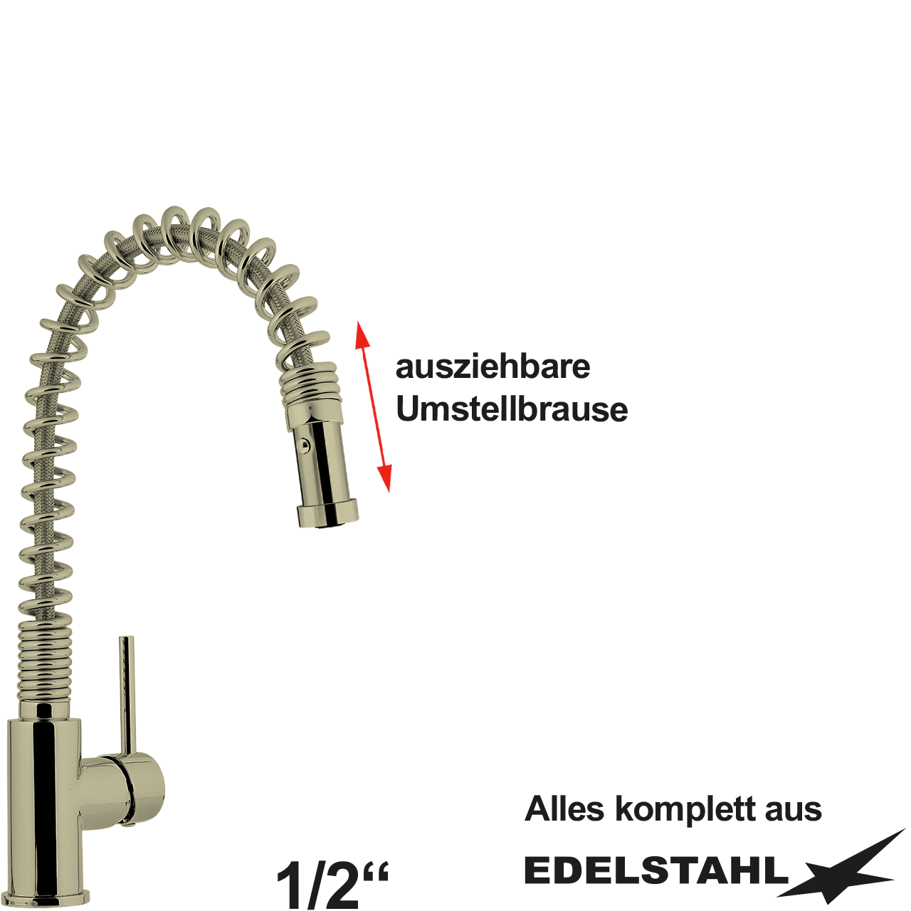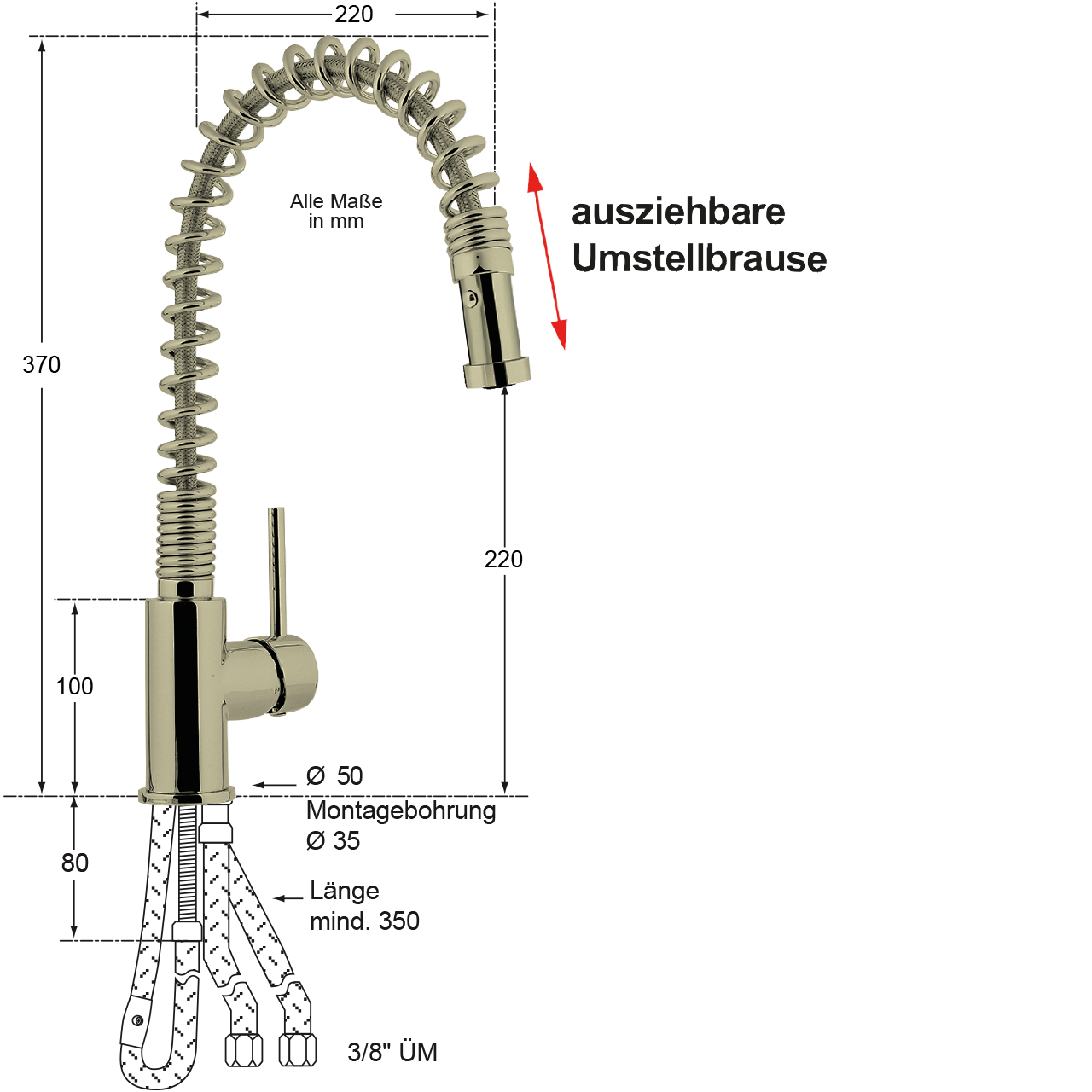 - Spültischbatterie 1/2″ A200 H220 mit Feder und ausziehbaren Auslaufstück eigensicher gegen Rückfluss und Zirkulation durch DVGW-zugelassene Rückflussverhinderer