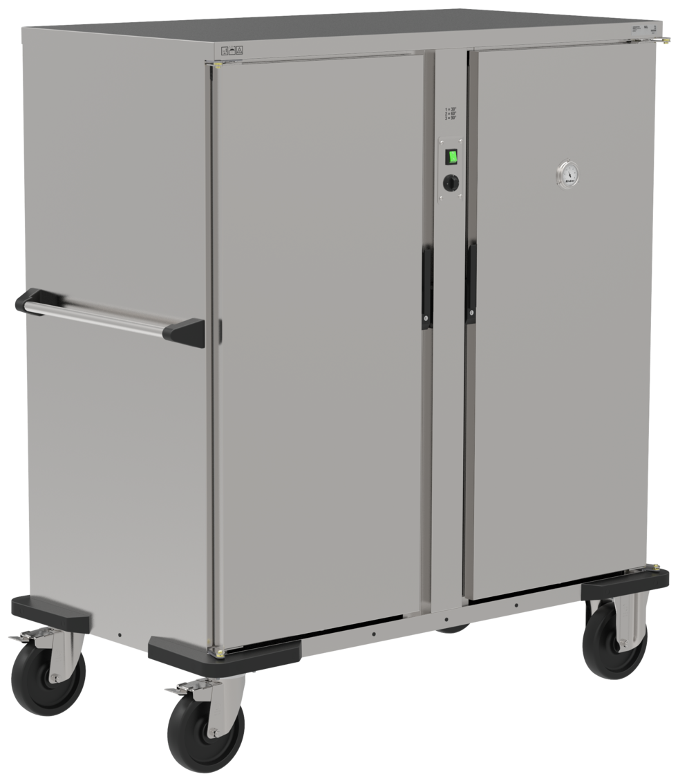 Der robuste Bankettwagen aufgeteilt in zwei Schrankabteile, mit analoger Umluftheizung, dient zum sicheren Transport, servierbereitem Warmhalten und zeitgleichem Ausgeben von Speisen im GN- oder Teller-System. Für mehr Flexibilität und perfekte Speisenqualität bei jedem Banketteinsatz – von der Portionierung bis zum Verzehr.
