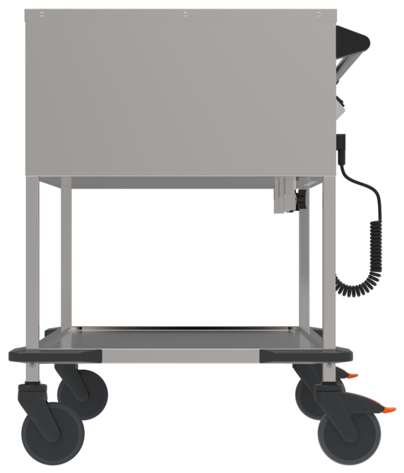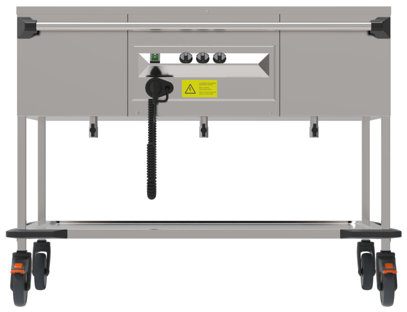 Speiseausgabewagen zum Transportieren und Ausgeben von warmen Speisen mittels Schöpfsystem auf Stationen.