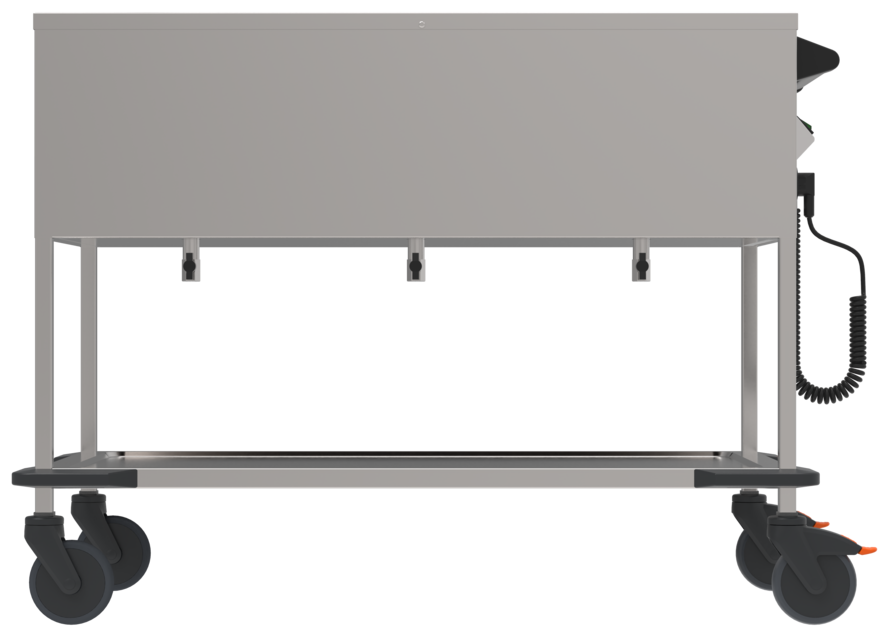 Speiseausgabewagen zum Transportieren und Ausgeben von warmen Speisen mittels Schöpfsystem auf Stationen.