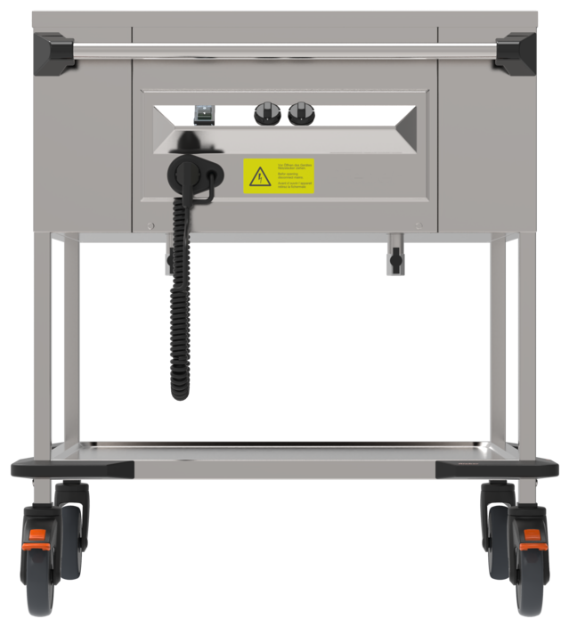 Speiseausgabewagen zum Transportieren und Ausgeben von warmen Speisen mittels Schöpfsystem auf Stationen.