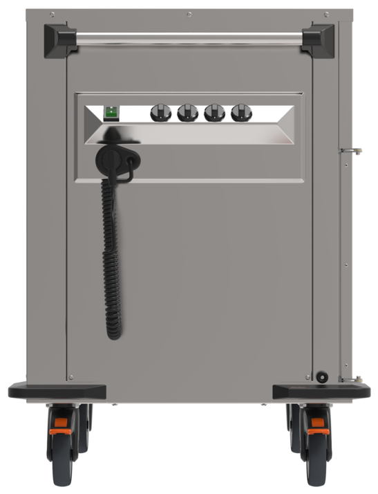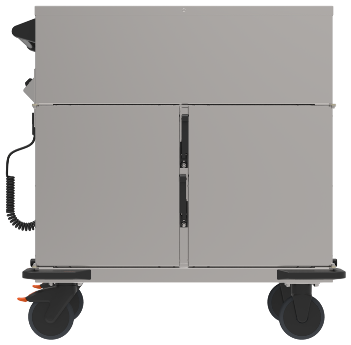 - Schrankraum, Türen doppelwandig, isoliert, Abmessung pro Fach: 330 x 570 x 364 mm. Türen selbstschließend, Transportverschluss. Innenraum dichtgeschweißt, Hygieneausführung H3. Mit je 8 Paar fugenlos tiefgezogenen Auflagesicken, Abstand 37 mm, zur Aufnahme von GN-Behältern bis GN 1/1.