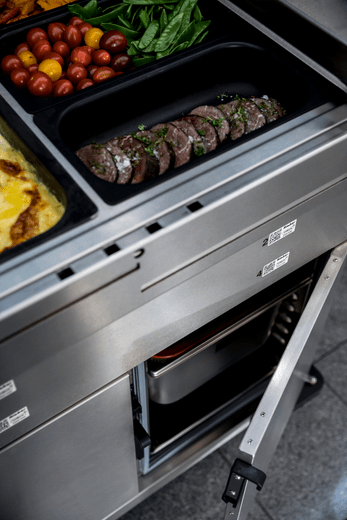 Kapazität: oben 2 x GN 1/1 Tiefe 200 mm und unten 2 beheizte Fächer mit Türen - beheizbar