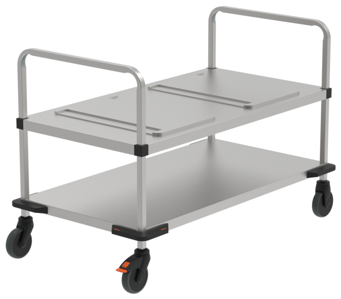 Das obere Bord ermöglicht durch die Prägung einen optimalen Halt während des Transportes sowie während der Ausgabe von Speisen. Das Bord ist stufenlos verstellbar von 350 bis 700mm. Das untere CNS-Ablagebord kann je nach Bedarf als Stellfläche vielfältig genutzt werden. Je nach Größe des Transport-/Ausgabewagens sowie des Bedarfs können bis zu 3 thermoporte® gleichzeitig transportiert werden. Der Wagen in Kombination mit unseren thermoprten® bietet das ideale System aus komfortablem Transport und erleichterter Ausgabe von Speisen.